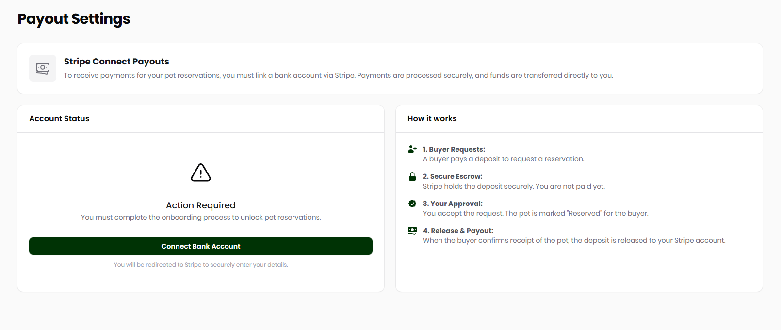 Security: All financial and personal information is handled by Stripe. The platform never stores your bank account numbers or sensitive identity information.