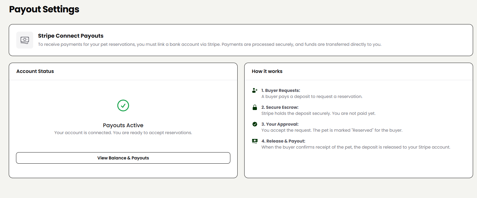 Return: Once you complete the steps on Stripe's website, Stripe automatically redirects you back to the Payout Settings page on our site.